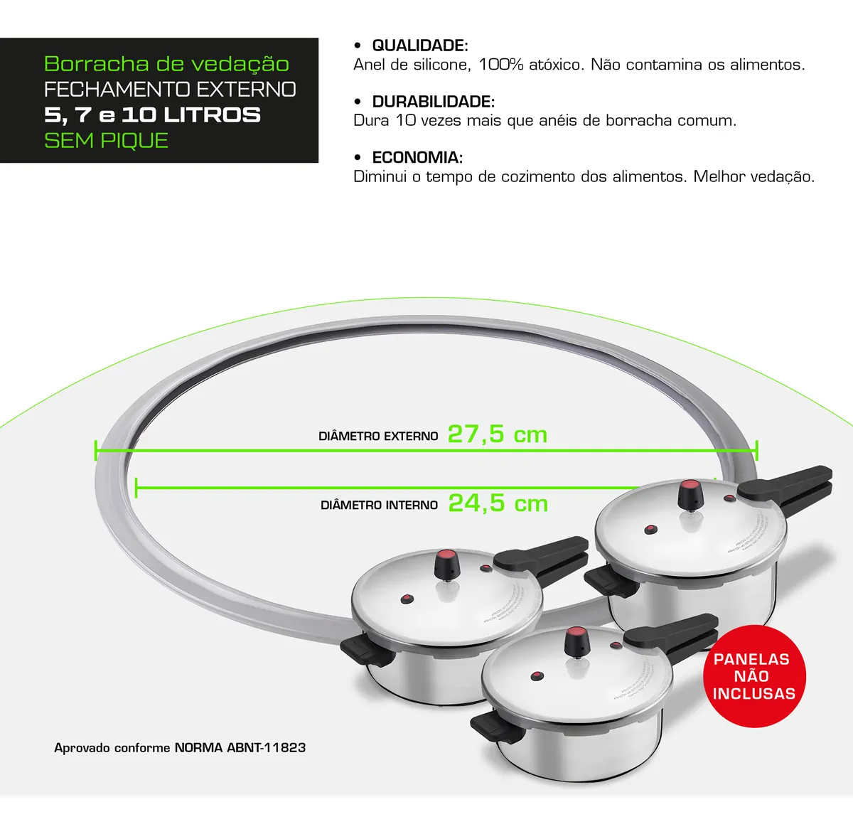 • Compatível com: Panela de Pressão Alumínio Nacional 5L / 7L / 10L (fechamento externo)