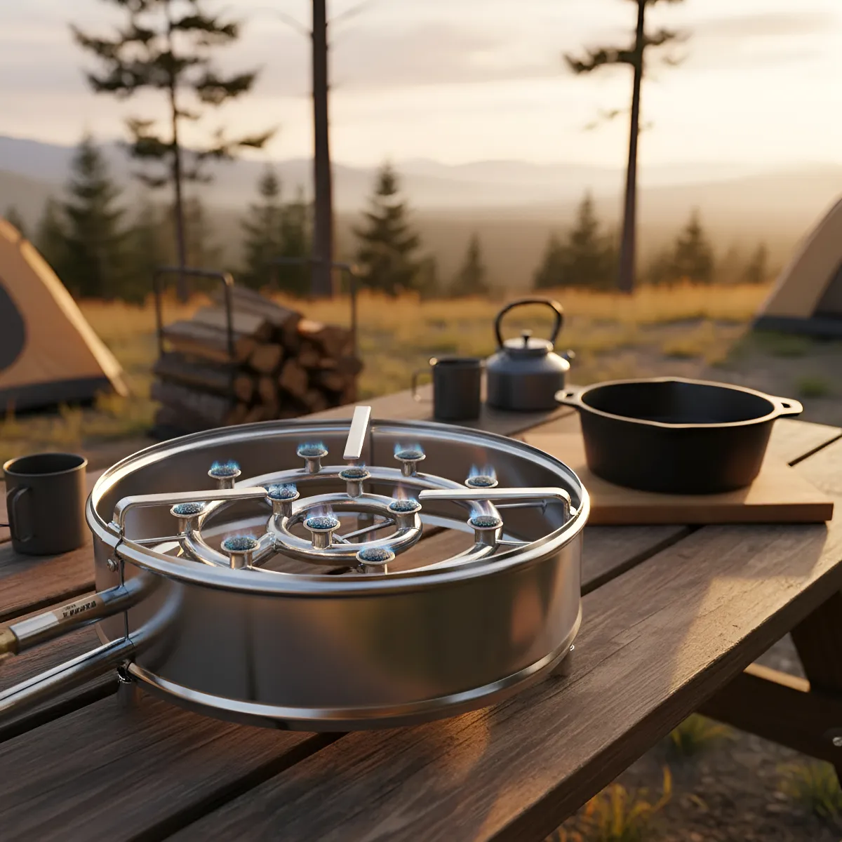 Fácil de transportar é ideal para uso em camping e em áreas externas. Ótimo desempenho para preparo rápido de alimentos. • Estrutura e queimadores em aço Carbono; • Funcionamento em alta pressão (Engate do registro direto no botijão); • Acompanha mangueira 80cm com registro (rosca grossa); • Revestimento Zincado; • Queimadores com acionamento independente; • Queimador menor 4 caulins; • Queimador maior 8 caulins.